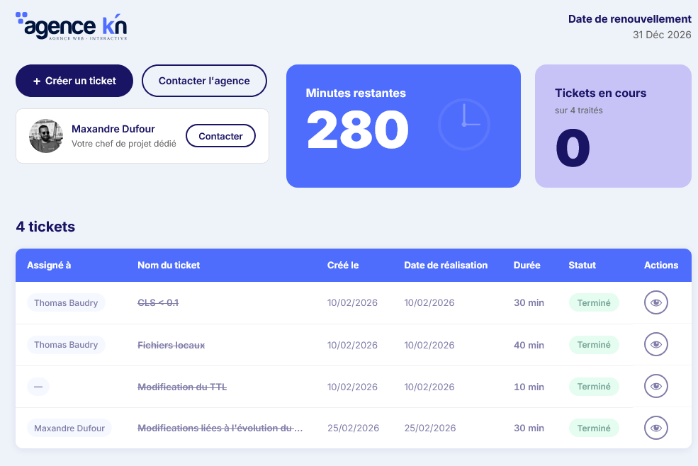 Notre outil de maintenance propriétaire s’intègre dans votre back-office WordPress. Plus besoin d’email ou d’application externe : vos demandes, leur suivi et votre crédit d’heures sont accessibles directement depuis votre administration.