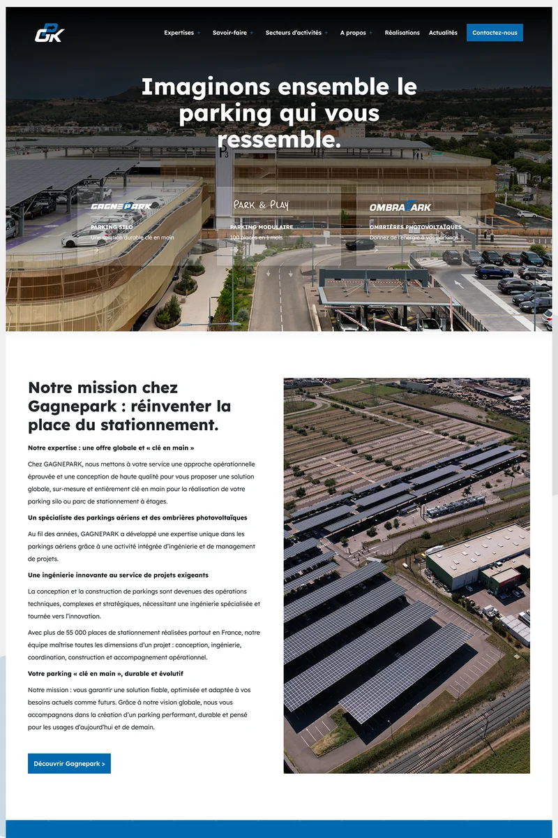 Gagnepark est un acteur spécialisé dans la conception et la réalisation de parkings silo, de parkings modulaires et d’ombrières photovoltaïques. Avec 80 experts intégrés et plus de 150 parkings réalisés, l’entreprise intervient pour des collectivités, des centres hospitaliers, des aéroports, des sites retail et des industriels.