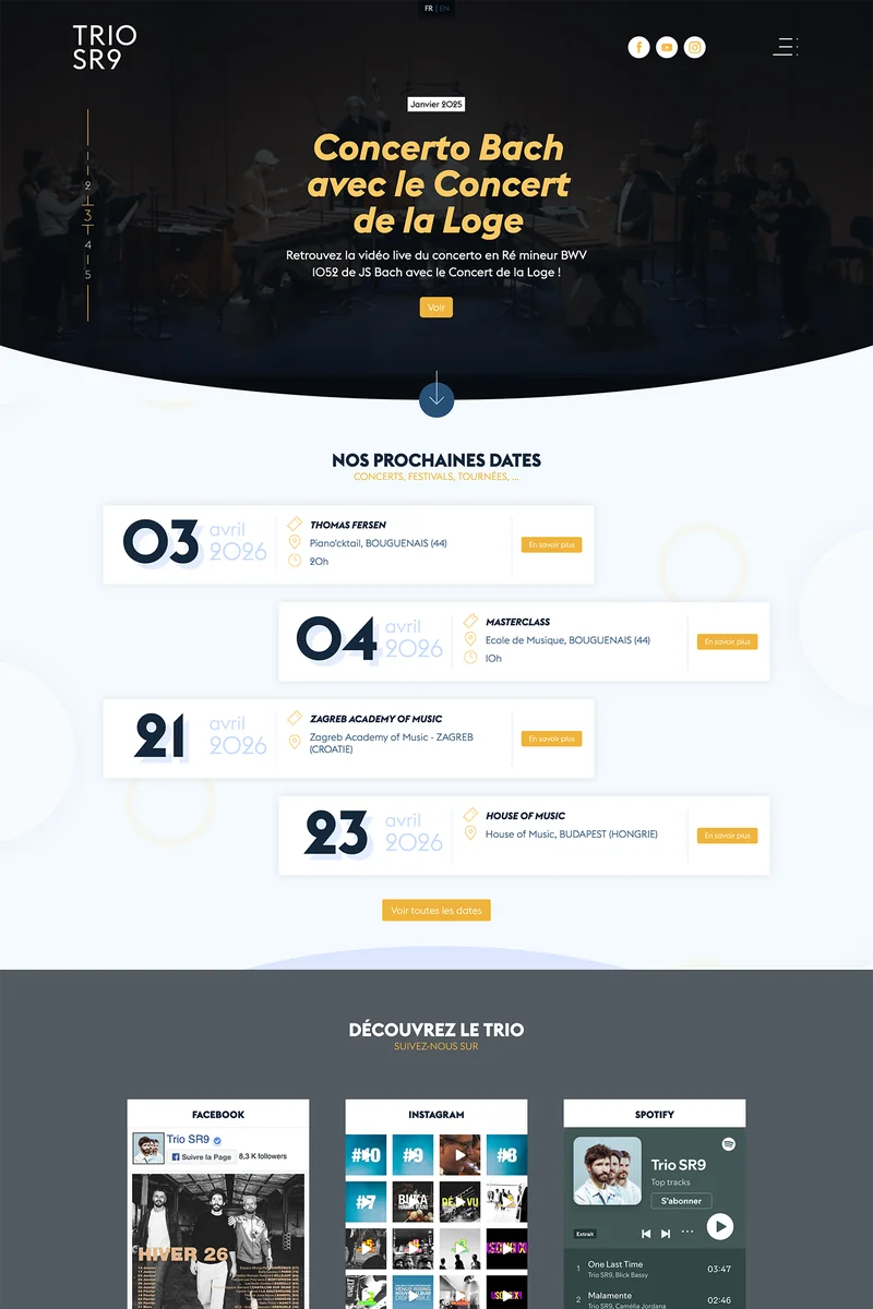 De Lyon à Tokyo, de Paris à Zagreb : le Trio SR9 tourne en France et à l’international, dans les festivals de musique de chambre, les salles de concert et les universités de musique. Une présence scénique régulière et une visibilité presse nationale et internationale.
