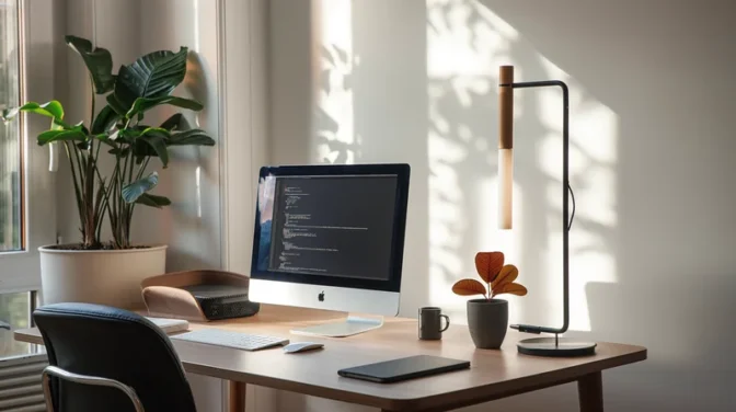 Espace de travail moderne avec ordinateur vide et plantes